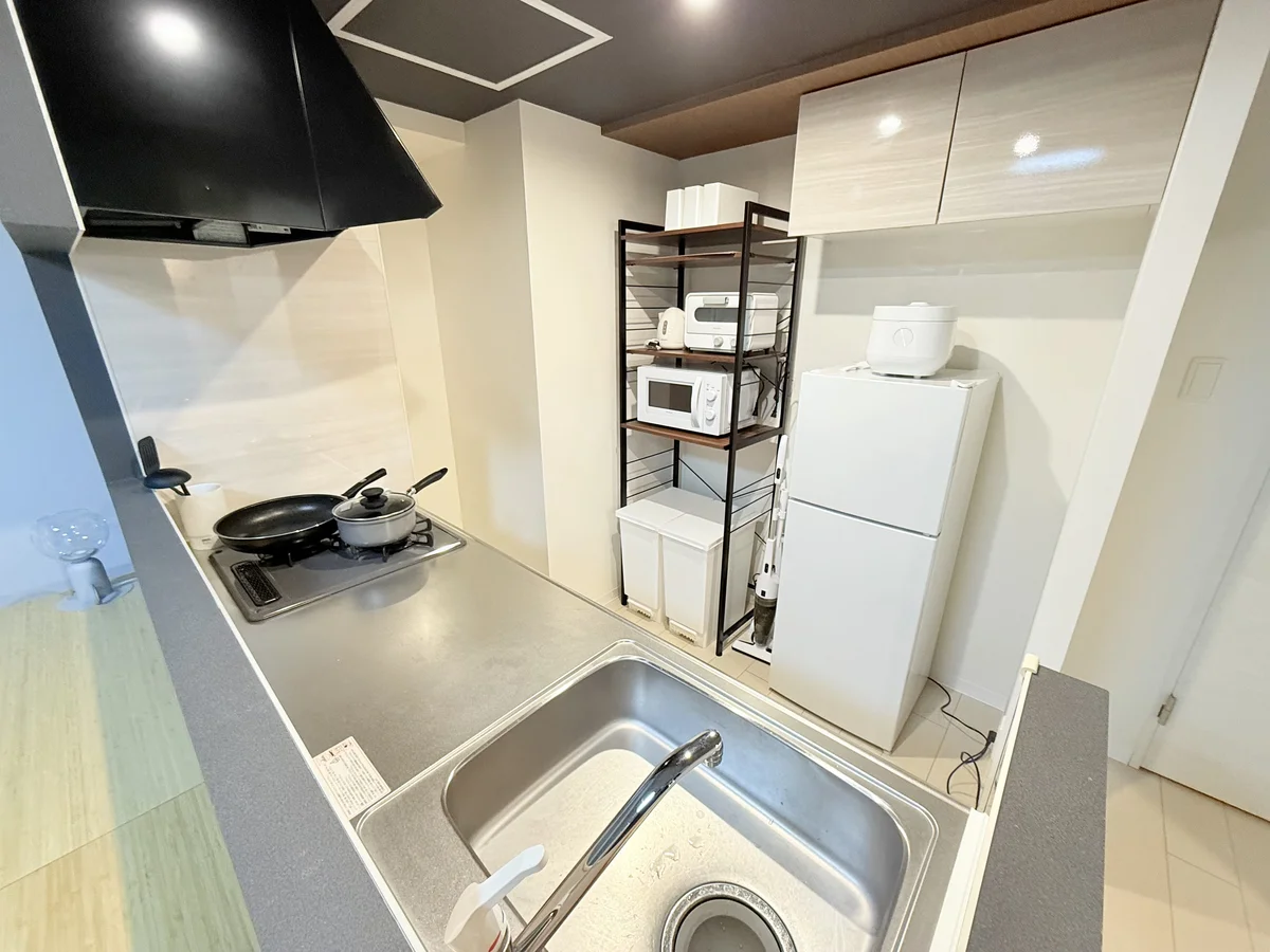お部屋は、ダブルベッドが2つの、最大4人まで宿泊できるお部屋です。キッチンには、鍋やフライパン、食器、電気ケトル、電子レンジ、トースター、炊飯器があります。