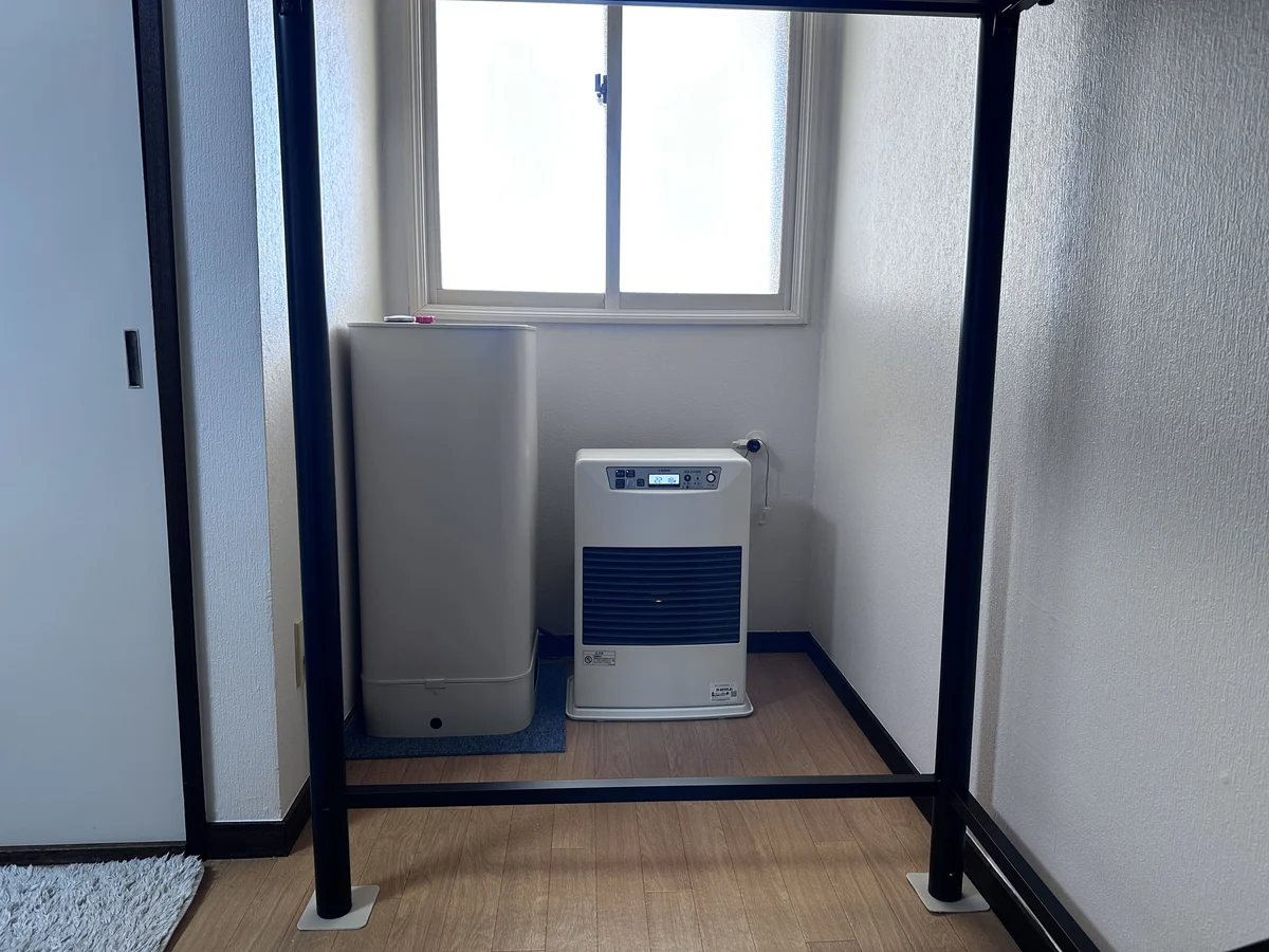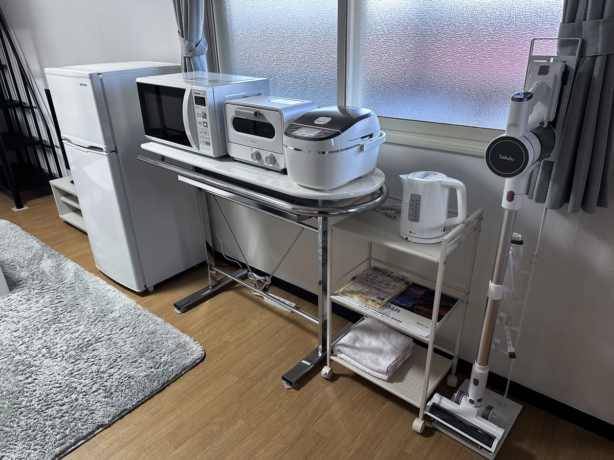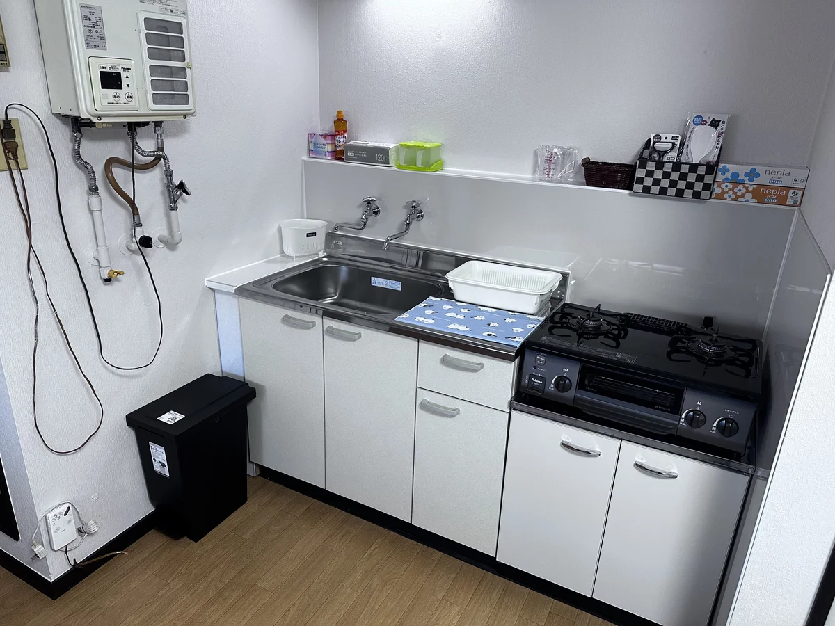 その他部屋設備:シャンプー・コンディショナー・ボディソープ(1日分)、洗濯洗剤、ごみ袋、食器用洗剤、食器セット、室内干しハンガー
