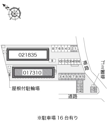 駐車場は全部で16台分ご用意しております。