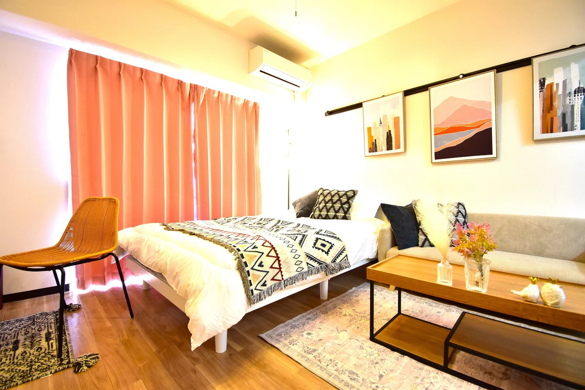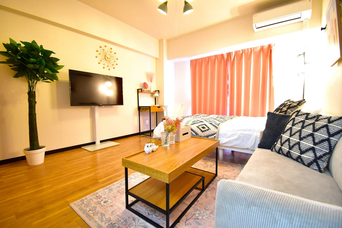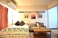 オートロック・駐車場対応可能な中区市役所徒歩1分のマンスリーです!室内にはダブルベッド・ソファー・ワークデスク完備のお部屋です。