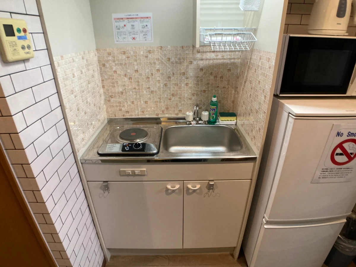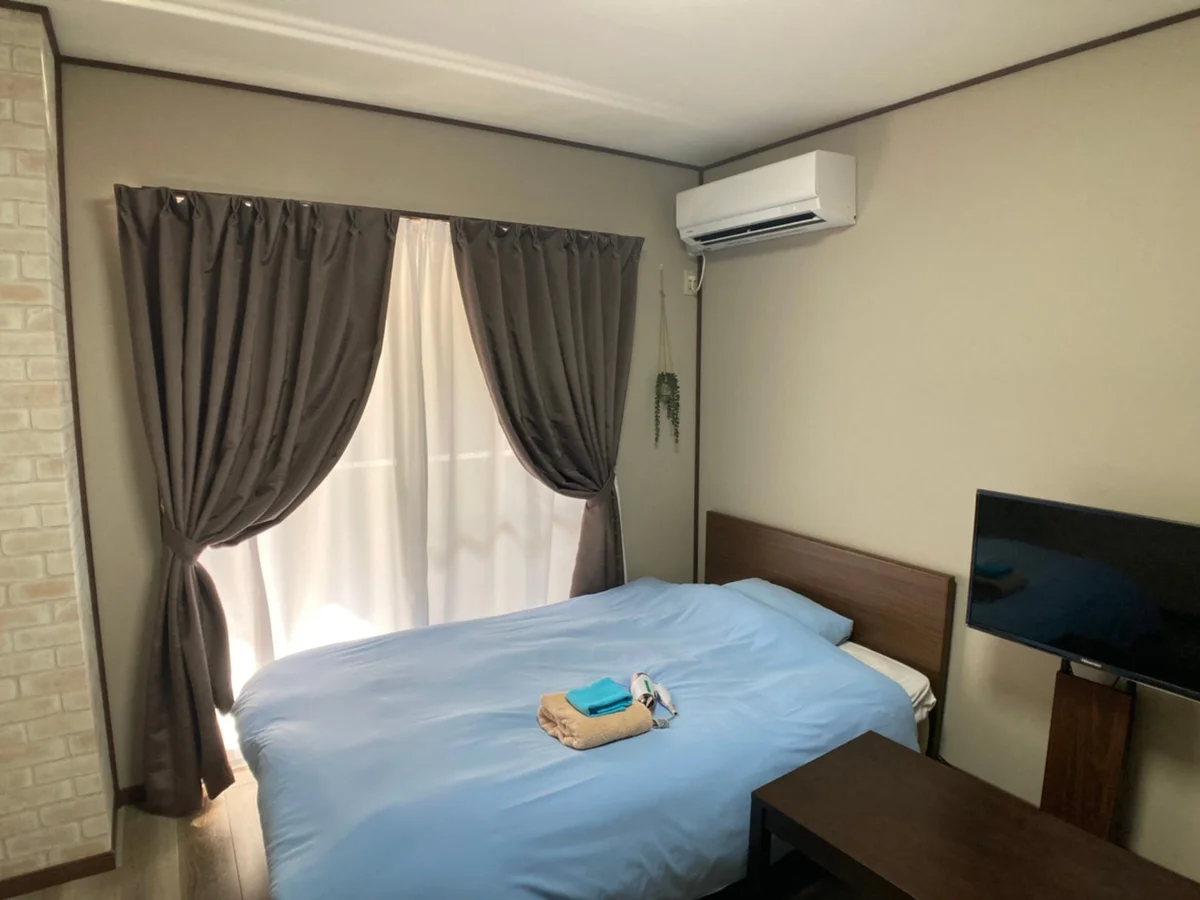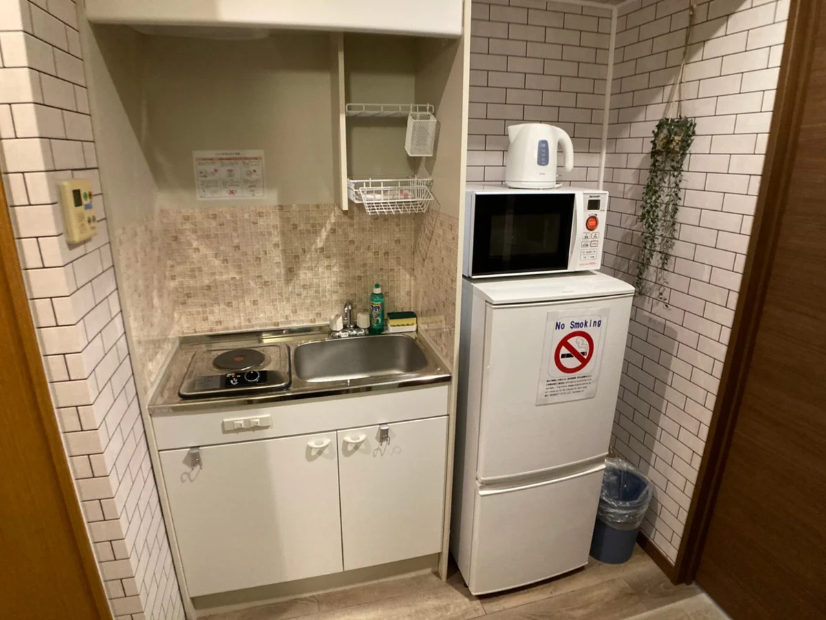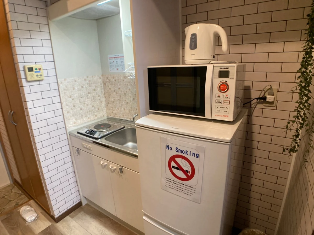 セミダブルベッド、デスク&チェア、テレビ、2ドア冷蔵庫、電子レンジ、電気ケトル、掃除機、ヘアドライヤー、クローゼット、シューズラック、ガスコンロ(1口)、フローリング、バス・トイレ別、バスタオル&ミニタオル(※宿泊人数分御用意)、ベランダ&窓、室内洗濯機、エアコン、インターネット(固定回線)、エレベーターなし、駐車場・駐輪場なし、ペット不可
