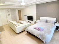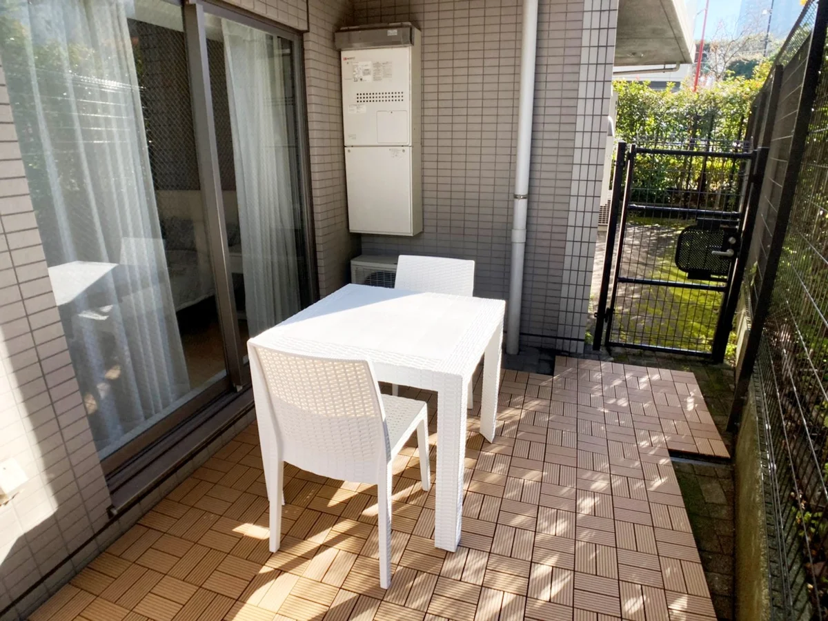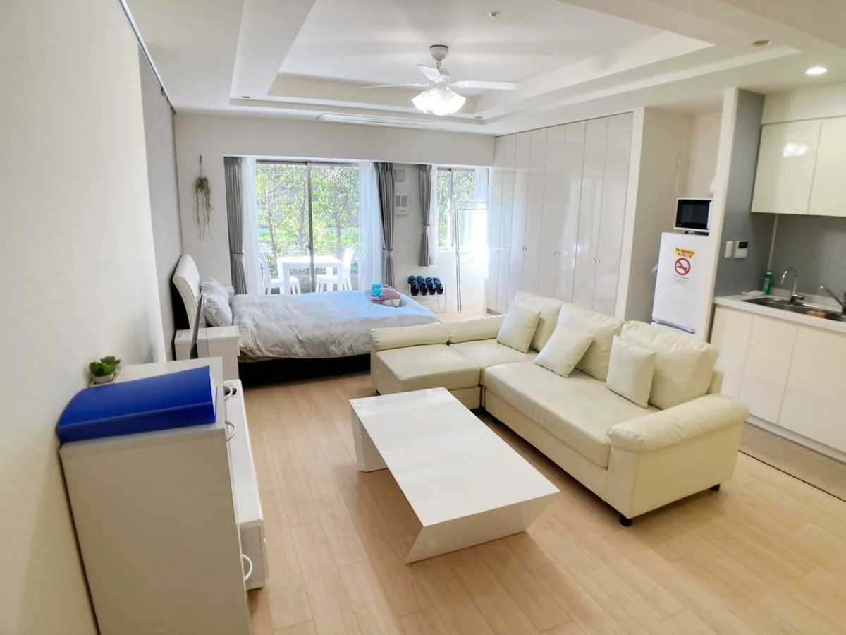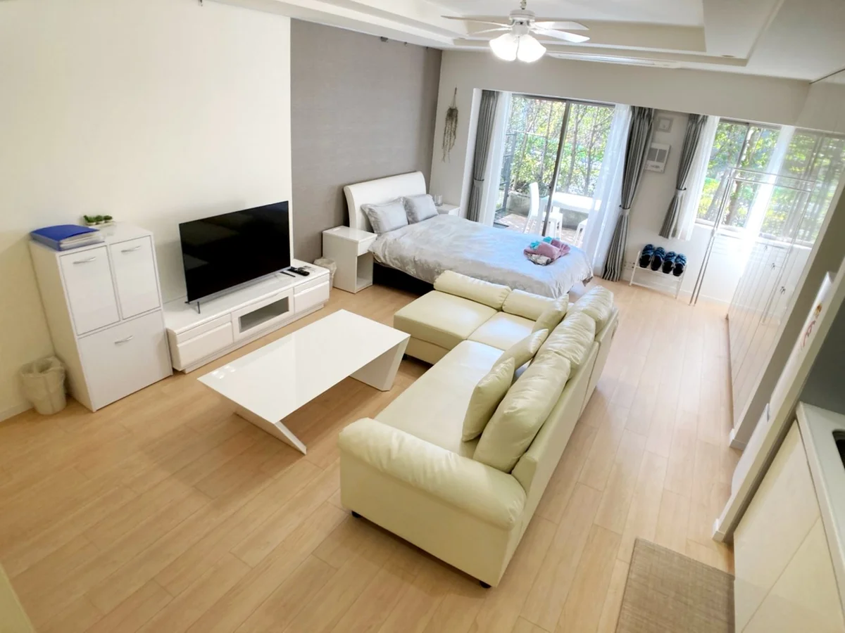 42型スマート液晶テレビ、大型カウチソファー、バス(浴室乾燥機付)、トイレ(ウォシュレット付)、独立洗面台、室内洗濯機置き場完備(ドラム式洗濯機)、システムキッチン(2口ガスコンロ)、フローリング、屋外用2名掛けカフェテーブル、エアコン、室内無料Wi-Fi、エントランスオートロックあり、エレベーターあり、駐車場・駐輪場なし、ペット可!