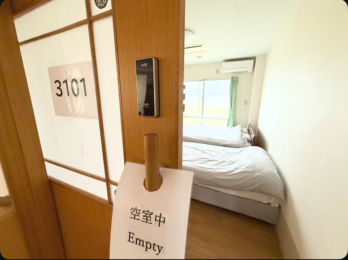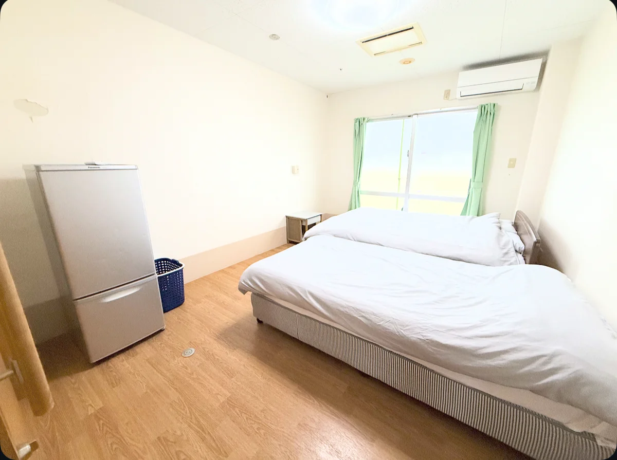 ハイ!沖縄 金武町店の個室は、プライバシーと快適さを兼ね備えた理想的な宿泊スペースです。清潔感あふれる空間には、シングルベッド2つとマットレス2つが設置されており、ゆったりとした時間を過ごすことができます。各部屋には専用のロッカーが完備されており、大切な荷物を安全に保管できます。