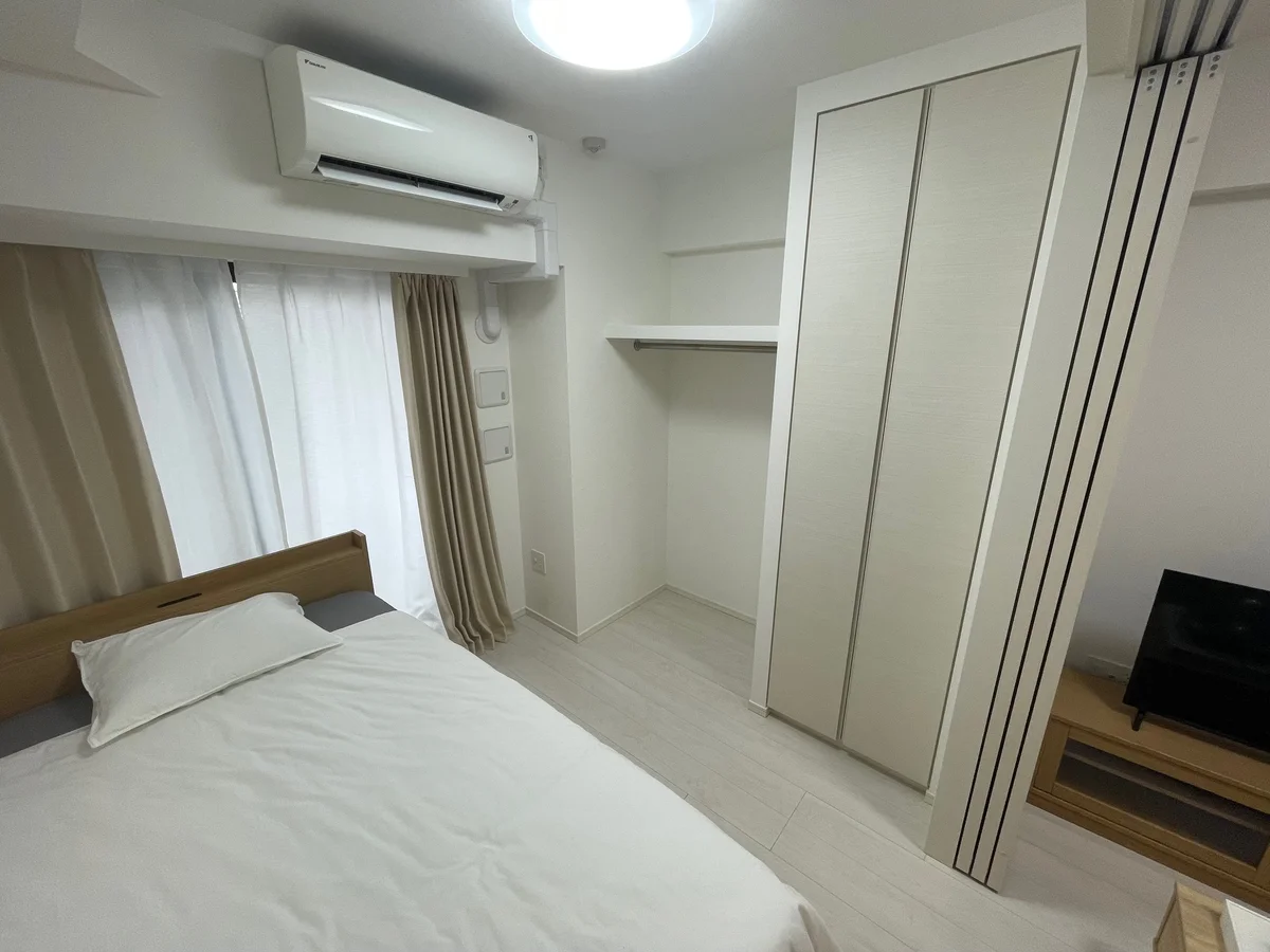 1DK角部屋、ダブルベッドのタイプで明るく日が差す間取りで長期の方にご利用いただいております。