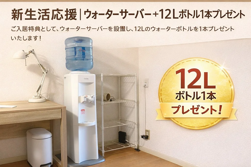 - 特典① ウォーターサーバー付き(12Lボトル1本プレゼント)
