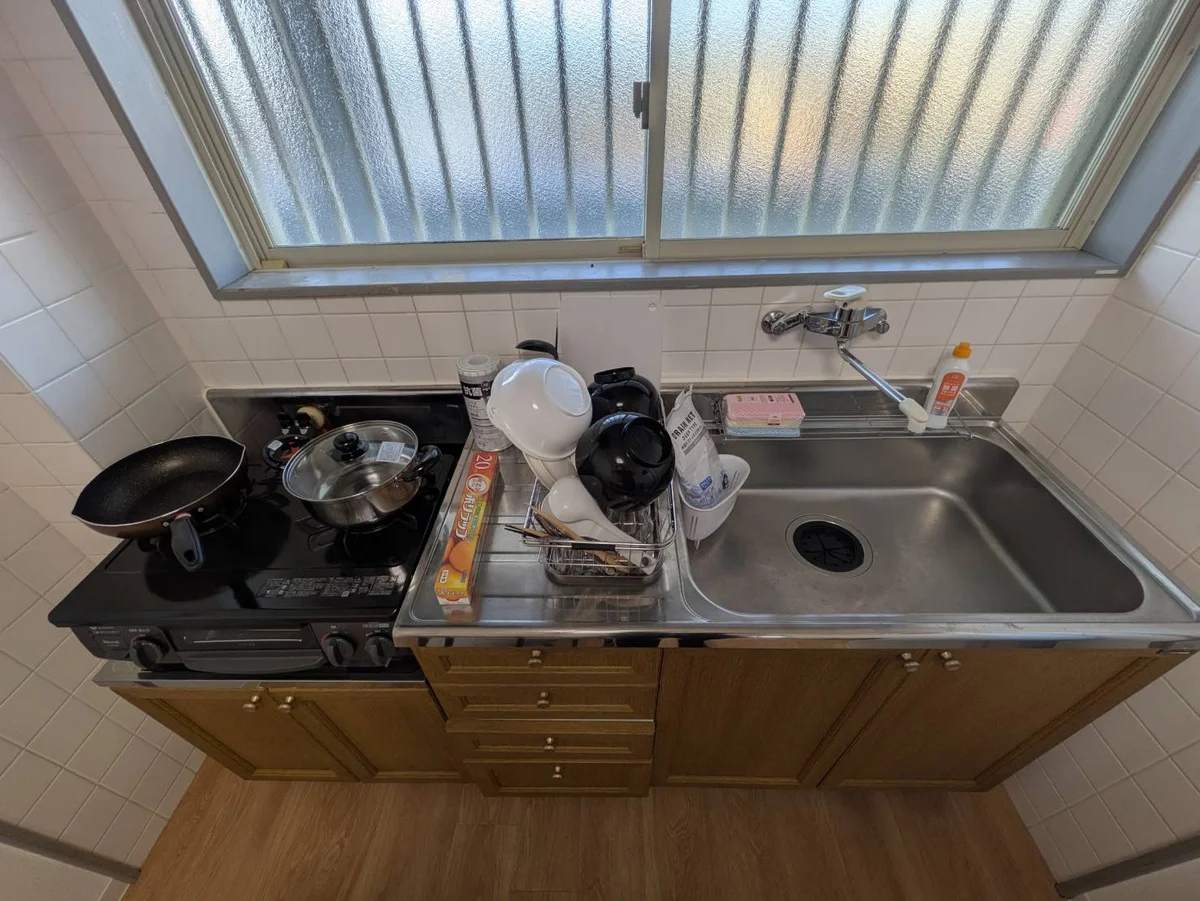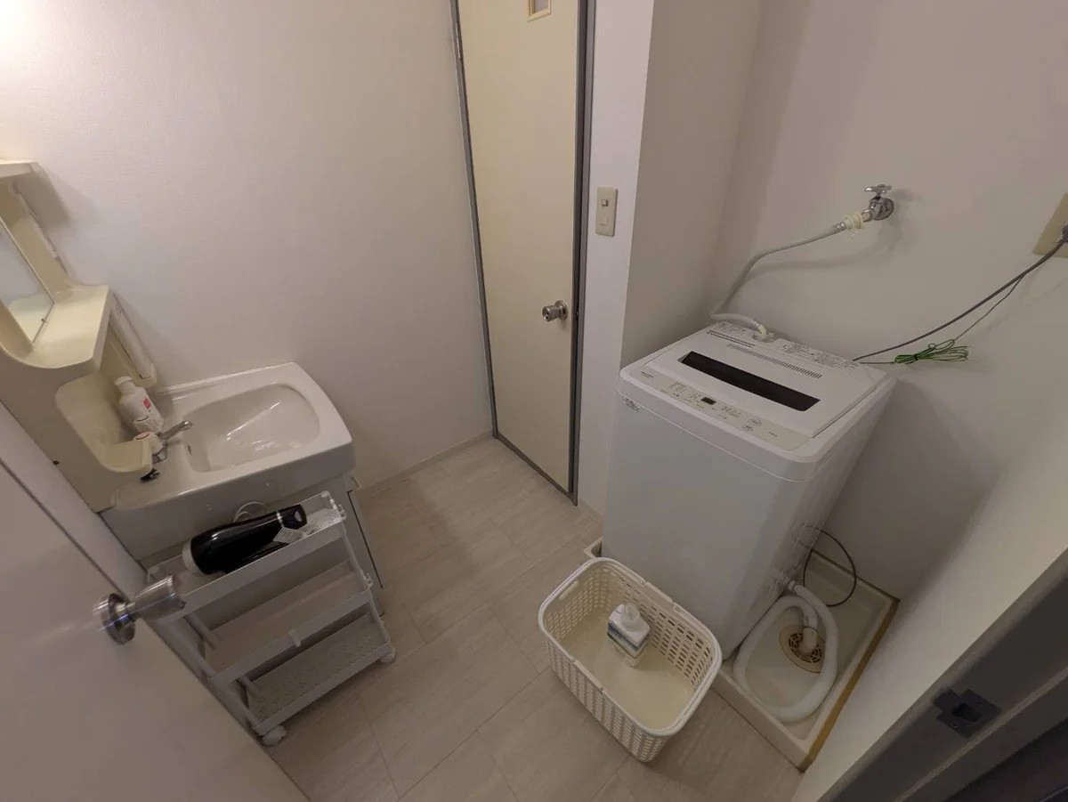 水切りカゴ、サランラップ、トイレ用ごみ箱、トイレマット、トイレ用ブラシ、ボディーソープ、バススポンジ、食器スポンジ、バス手桶、バス椅子、食器洗剤、洗濯洗剤、浴室洗剤、トイレ洗剤、シャンプー、リンス、まな板、包丁、お茶碗×2、汁椀×2、お椀、お皿、マグカップ、グラス、箸×2、スプーン×2、フォーク×2、お玉、フライ返し、ボウル、鍋、カット台布巾