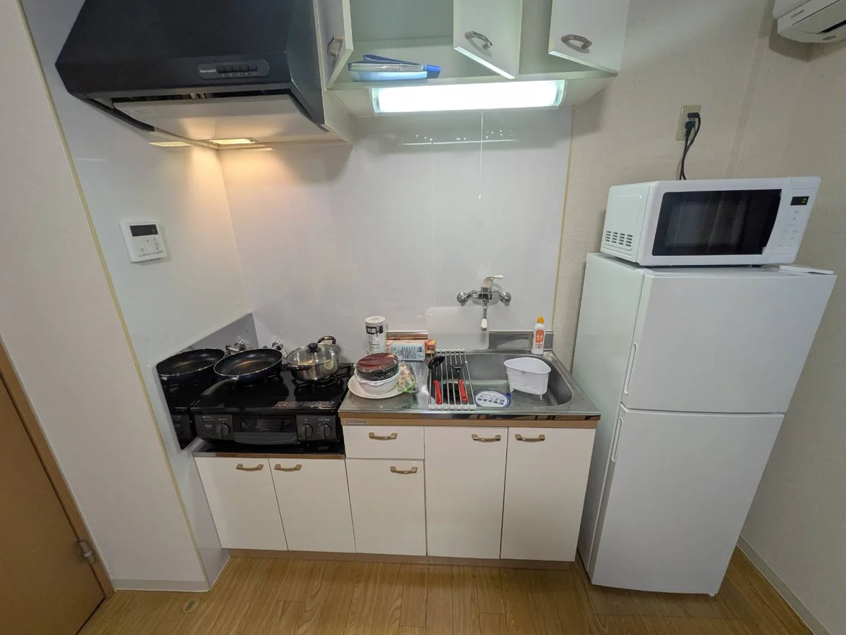 シングルベット、マットレス、フローリングワイパー、電子レンジ、炊飯器、電気ケトル、ソファ(一人掛け)、デスク、チェアー、ローテーブル、スタンドミラー、ドライヤー、DVDプレイヤー、TV台、TV、洗濯機(室内)、冷蔵庫、カーテン(レース付き)、かさ立て、置き時計