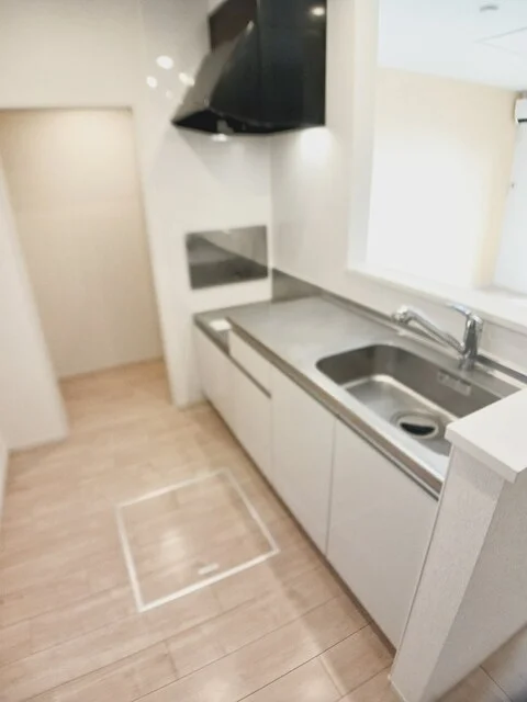 開放感のあるリビングと機能的なキッチンを備えた快適1LDK。使いやすいシステムキッチン付きで、快適なマンスリー滞在を実現します。