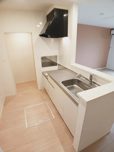 開放感のあるリビングと機能的なキッチンを備えた快適1LDK。使いやすいシステムキッチン付きで、快適なマンスリー滞在を実現します。