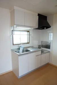 開放感のあるリビングと機能的なキッチンを備えた快適1LDK。使いやすいシステムキッチン付きで、快適なマンスリー滞在を実現します。