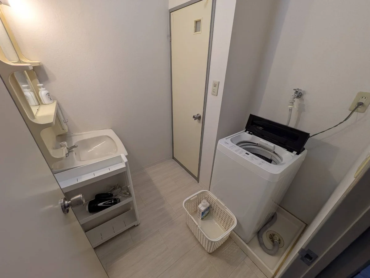 水切りカゴ、ラップ、トイレ用ごみ箱、トイレマット、トイレ用ブラシ、ボディーソープ、バススポンジ、食器スポンジ、バス手桶、バス椅子、食器洗剤、洗濯洗剤、浴室洗剤、トイレ洗剤、シャンプー、リンス、まな板、包丁、お茶碗×2、汁椀×2、お椀、お皿、マグカップ、グラス、箸×2、スプーン×2、フォーク×2、お玉、フライ返し、ボウル、鍋、カット台布巾