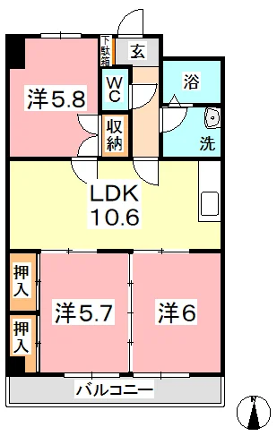 | 間取り | 3LDK LDK10.6畳×洋室6畳×洋室5.8畳×洋室5.7畳 | 面積 | 63.2m² |