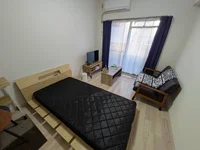 シングルベット、マットレス、フローリングワイパー、電子レンジ、炊飯器、電気ケトル、ソファ、ローテーブル、デスク、チェアー、スタンドミラー、ドライヤー、DVDプレイヤー、TV台、スマートTV、洗濯機(室内)、冷蔵庫、カーテン(レース付き)、3段ラック、かさ立て、置き時計