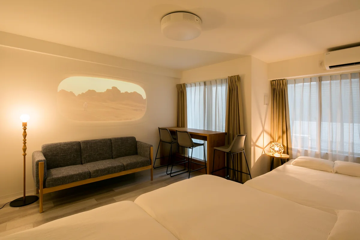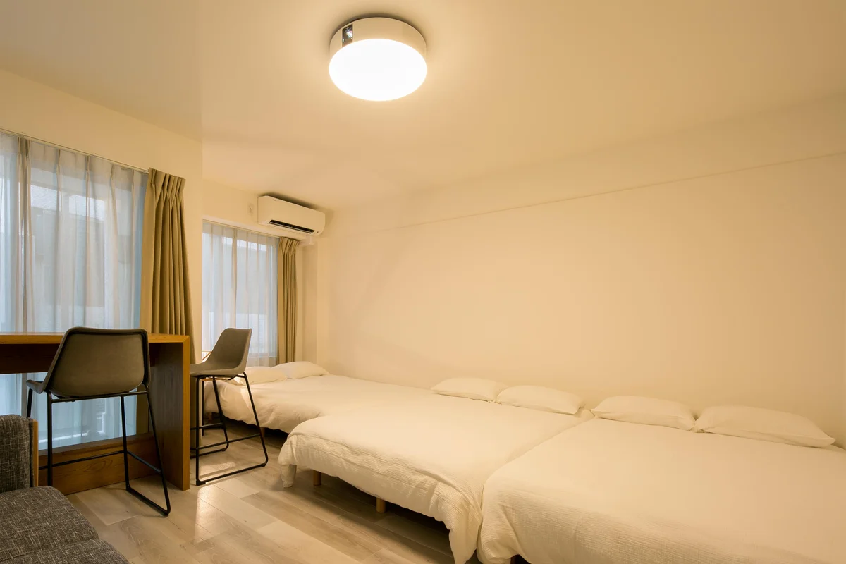 お部屋は1K・32.40㎡のゆとりある空間に、ダブルベッド3台を配置し、最大6名までご宿泊可能。ご家族でのご利用はもちろん、同僚との長期出張やグループでの滞在にもおすすめです。
