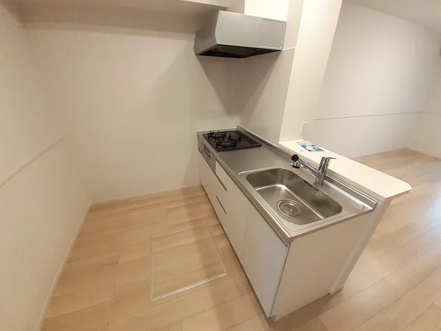 開放感のあるリビングと機能的なキッチンを備えた快適1LDK。使いやすいシステムキッチン付きで、快適なマンスリー滞在を実現します。