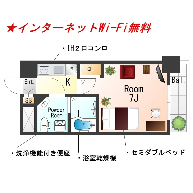 【禁煙ルーム・1R・セミダブルベッド・】★インターネッ トWi- Fiレンタル可★独立洗面台・浴室乾燥機・温水洗浄便座・ガス2口キッチン など設備充実★