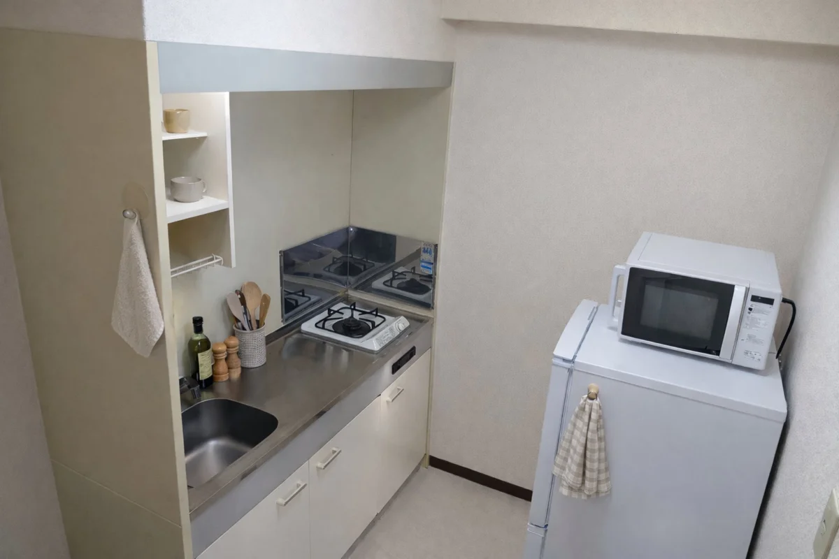 ・シングルベッド・布団セット・デスク・イス・冷蔵庫・洗濯機・掃除機・テレビ・電子レンジ・電気ケトル・ドライヤー・カーテン・バスタオル・フェイスタオル・トイレットペーパー・テッシュペーパー・シャンプー・コンディショナー・ボディソープ・トイレブラシ