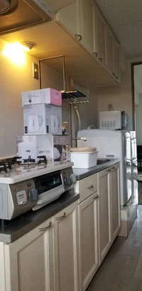 ★キッチン用品(フライパン、鍋など)、食器類(紙皿等)はオプション設置になります。新品販売です(キッチンセット9,900円(税込))。お問い合わせください。