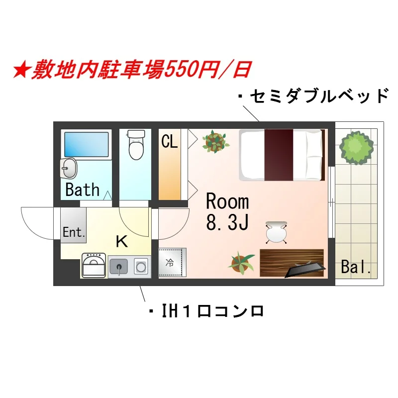 【セミダブルベッド】★敷地内駐車場550円/日★バストイレセパレート★インターネットWiFiレンタル可★
