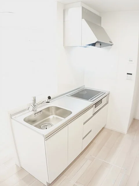 開放感のあるリビングと機能的なキッチンを備えた快適1LDK。使いやすいシステムキッチン付きで、快適なマンスリー滞在を実現します。