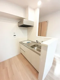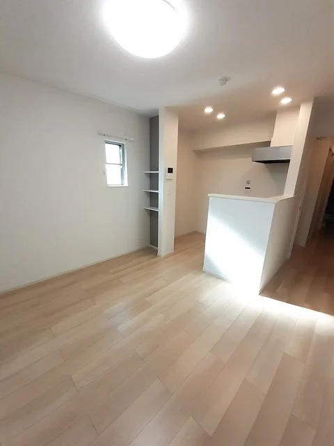 開放感のあるリビングと機能的なキッチンを備えた快適1LDK。使いやすいシステムキッチン付きで、快適なマンスリー滞在を実現します。