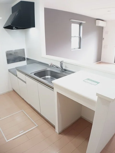 開放感のあるリビングと機能的なキッチンを備えた快適1LDK。使いやすいシステムキッチン付きで、快適なマンスリー滞在を実現します。