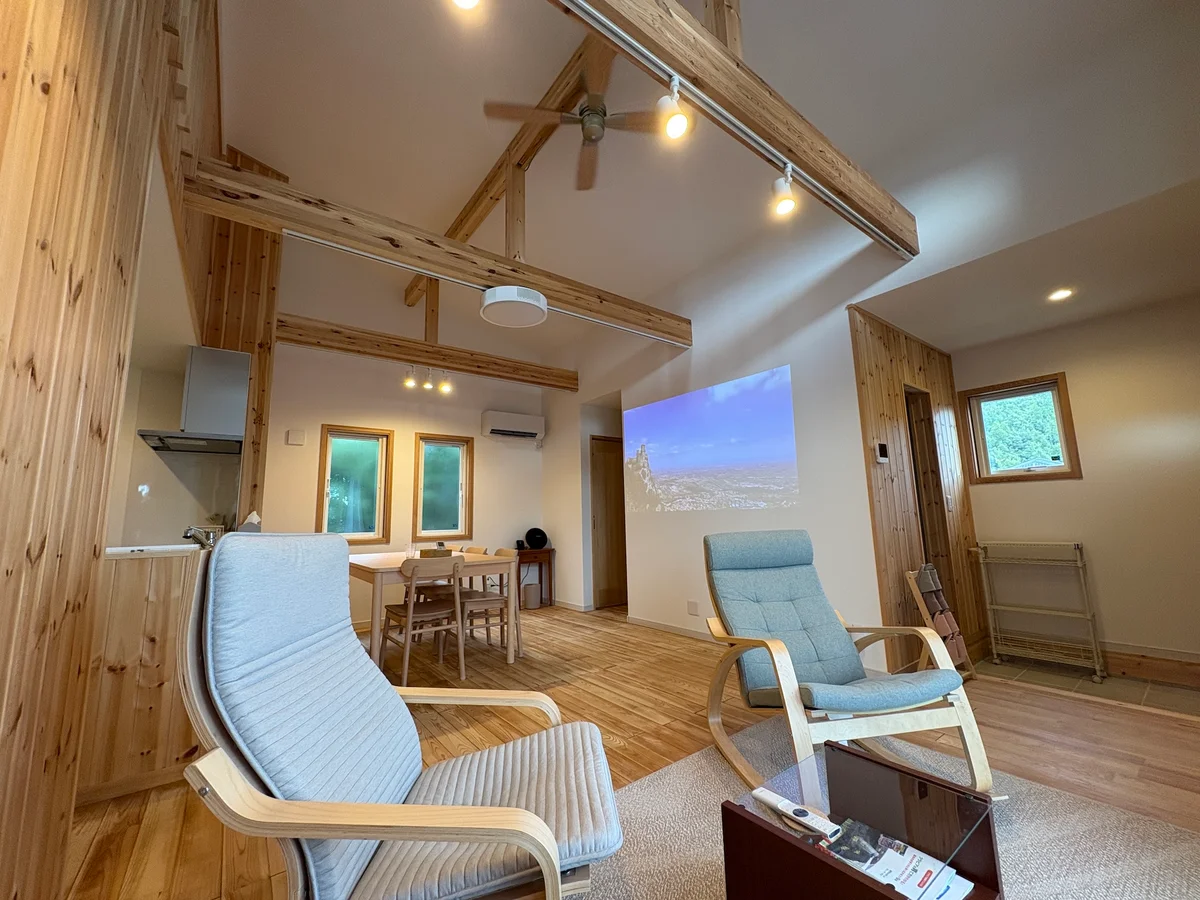 プロジェクター(Aladin X)を設置しておりますので、大画面で映画などもお楽しみいただけます。(Amazo Prime, Netflix, Disney+視聴可能)