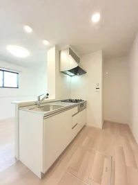 開放感のあるリビングと機能的なキッチンを備えた快適1LDK。使いやすいシステムキッチン付きで、快適なマンスリー滞在を実現します。