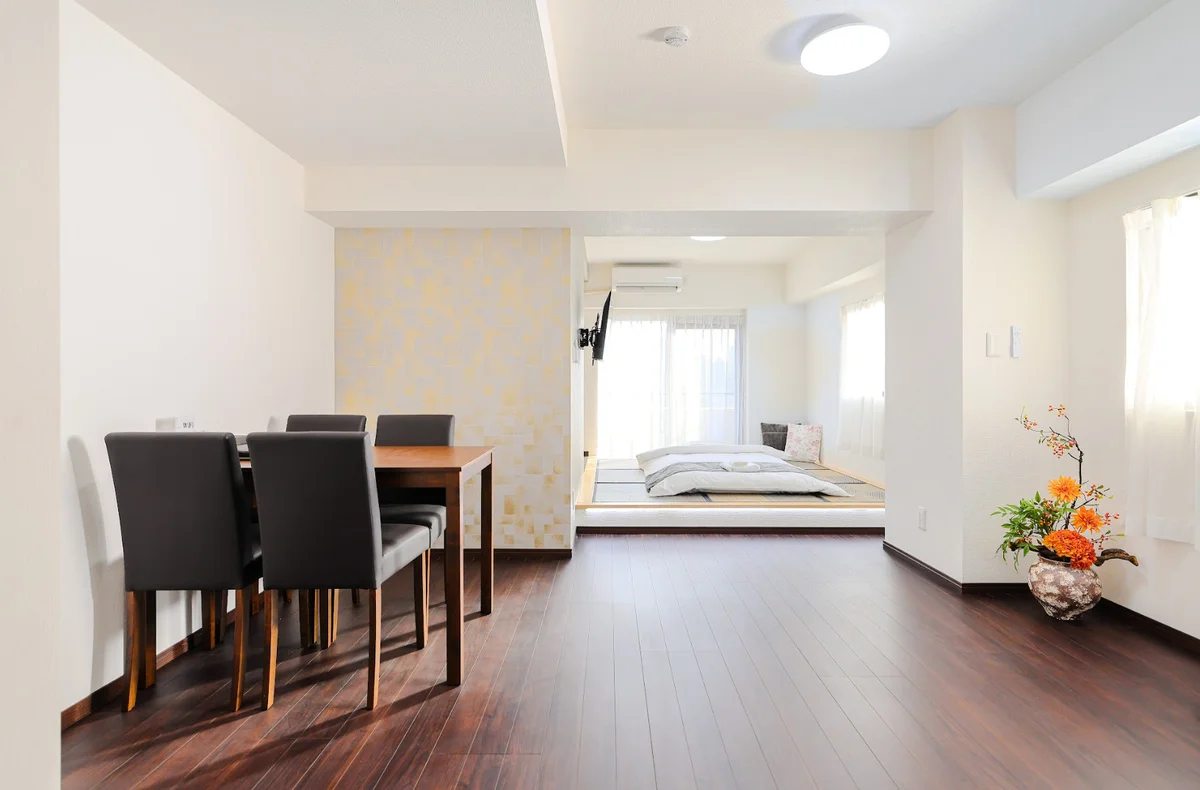 和風の落ち着いたデザインを取り入れた空間で、ゆったりとくつろげる雰囲気が特徴です。シャワールームにはインテリジェントトイレを設置し、洗面台付きのバス・トイレ別仕様で清潔かつ便利。エアコン完備で一年中快適にお過ごしいただけます。テレビも備えており、滞在中のリラックスタイムにも最適です。