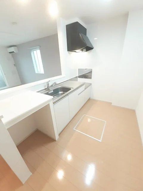 開放感のあるリビングと機能的なキッチンを備えた快適1LDK。使いやすいシステムキッチン付きで、快適なマンスリー滞在を実現します。