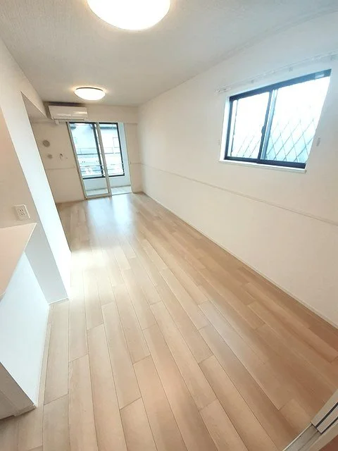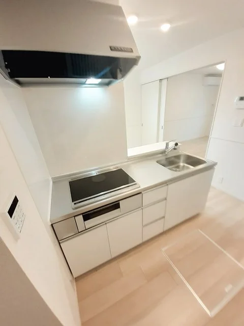 開放感のあるリビングと機能的なキッチンを備えた快適1LDK。使いやすいシステムキッチン付きで、快適なマンスリー滞在を実現します。