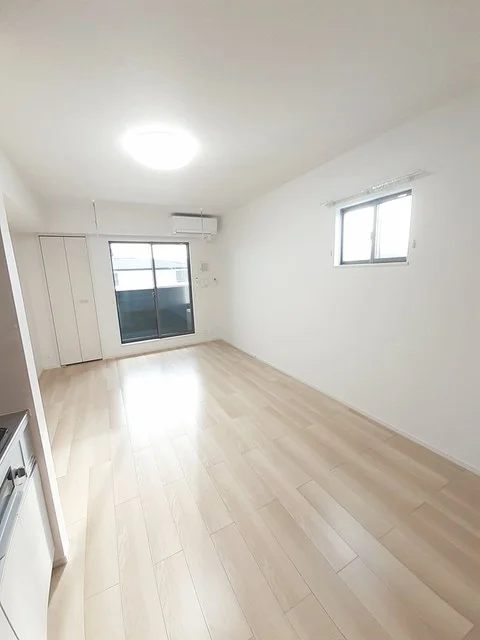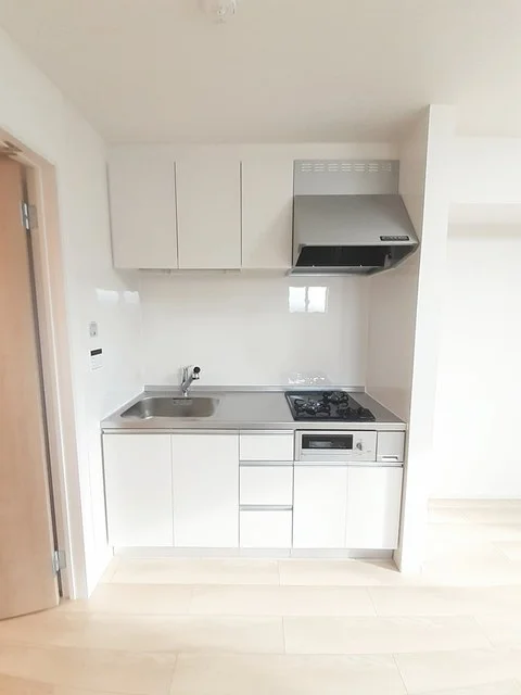 開放感のあるリビングと機能的なキッチンを備えた快適1LDK。使いやすいシステムキッチン付きで、快適なマンスリー滞在を実現します。