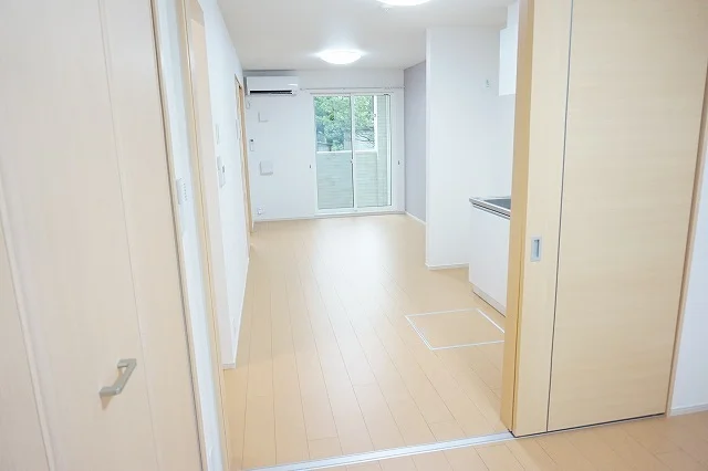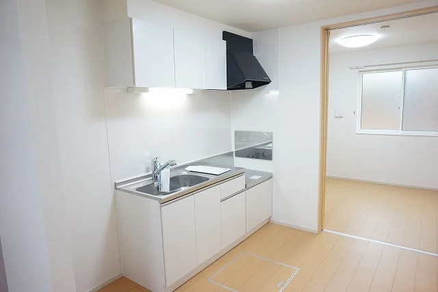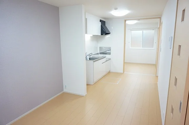開放感のあるリビングと機能的なキッチンを備えた快適1LDK。使いやすいシステムキッチン付きで、快適なマンスリー滞在を実現します。