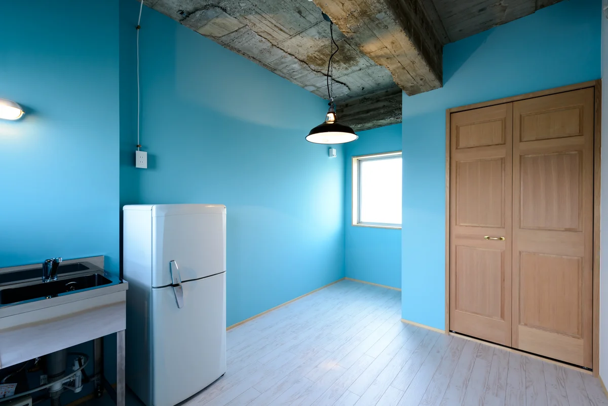 個室は約12㎡ほどのミニキッチン付きワンルーム。各階にバスルーム1箇所、トイレ2箇所、洗濯機1台、乾燥機1台ございます。