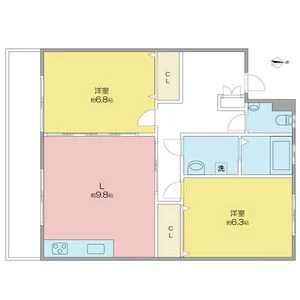 | 間取り | 2DK 洋室6.3帖、洋室6.8帖、DK9.8帖 | 面積 | 58m² |