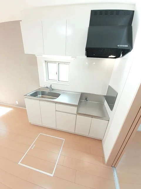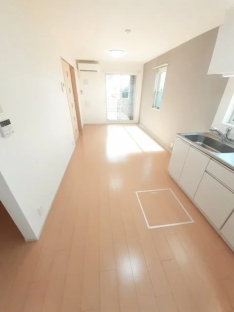 開放感のあるリビングと機能的なキッチンを備えた快適1LDK。使いやすいシステムキッチン付きで、快適なマンスリー滞在を実現します。