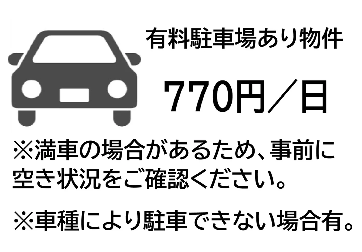 敷地駐車場利用時770円/日の追加料金が発生いたします。 駐車場の台数には限りがあります。(車両サイズによってはご利用いただけない場合有り。) 【ポケットWi-Fiレンタル】220円/日が必要。(※事前予約が必要です) 部屋の写真はイメージです。 |