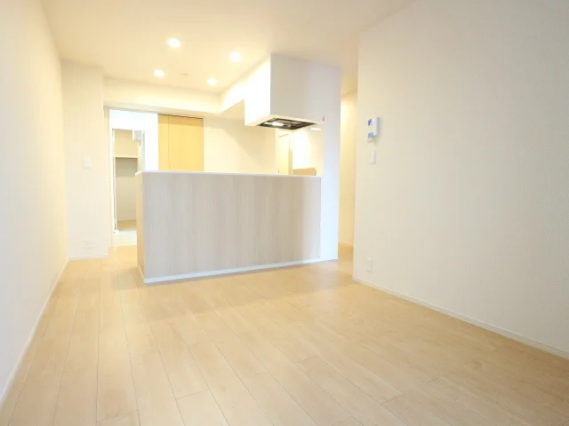 開放感のあるリビングと機能的なキッチンを備えた快適1LDK。使いやすいシステムキッチン付きで、快適なマンスリー滞在を実現します。