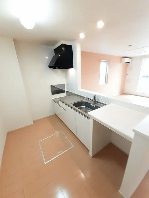 開放感のあるリビングと機能的なキッチンを備えた快適1LDK。使いやすいシステムキッチン付きで、快適なマンスリー滞在を実現します。