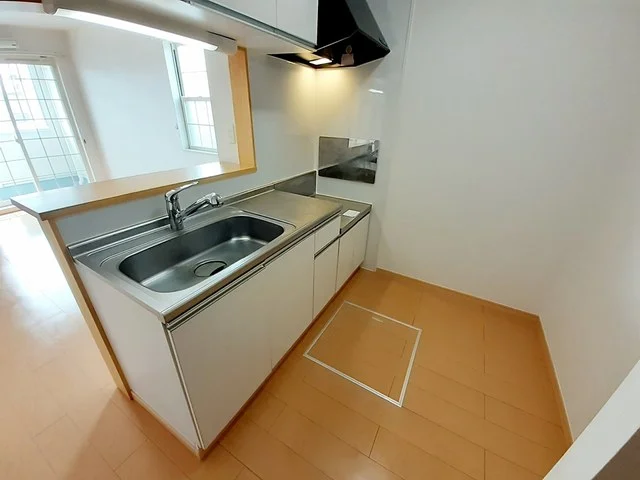 開放感のあるリビングと機能的なキッチンを備えた快適1LDK。使いやすいシステムキッチン付きで、快適なマンスリー滞在を実現します。