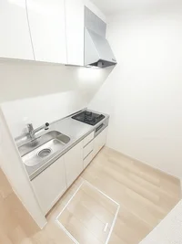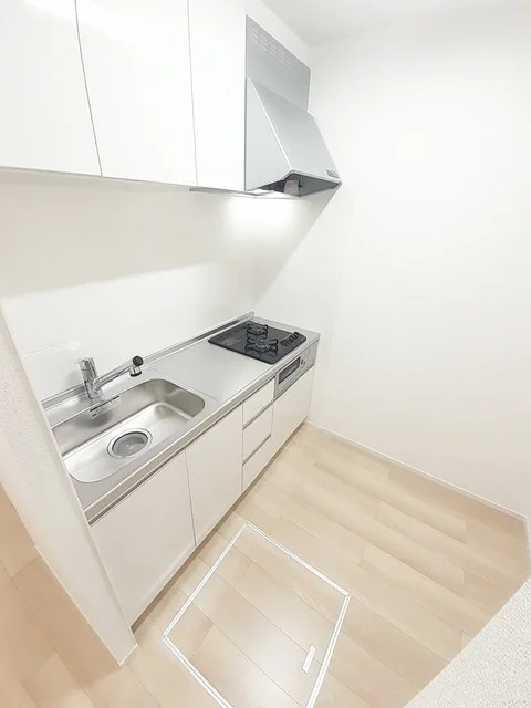 開放感のあるリビングと機能的なキッチンを備えた快適1LDK。使いやすいシステムキッチン付きで、快適なマンスリー滞在を実現します。