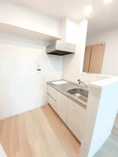 開放感のあるリビングと機能的なキッチンを備えた快適1LDK。使いやすいシステムキッチン付きで、快適なマンスリー滞在を実現します。