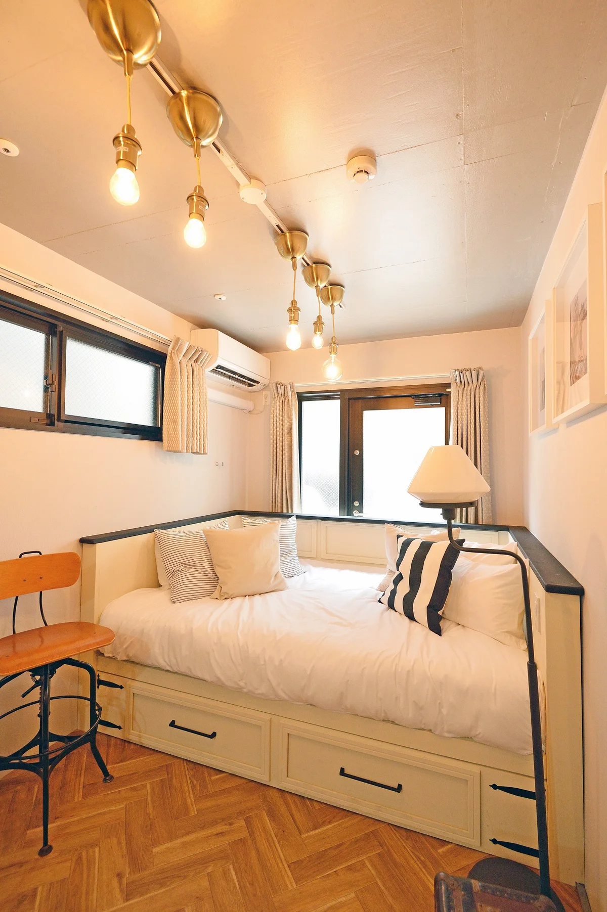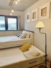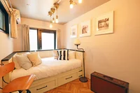 広く窓に面しており、自然光、風を感じられる落ち着ける空間です。広さに対して少し使いにくいレイアウトですが、上手く空間を分けてリモート環境の設定も可能な間取りです。