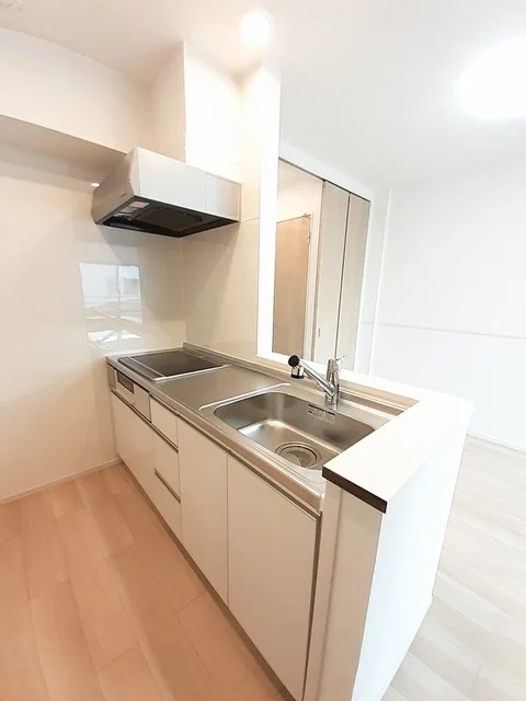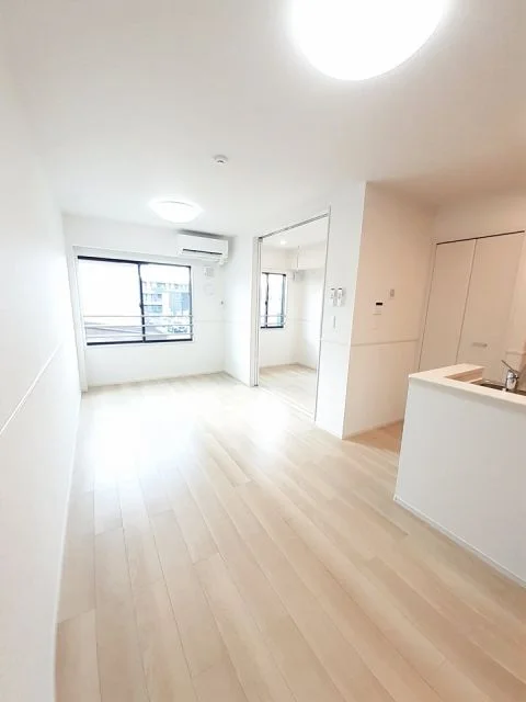 開放感のあるリビングと機能的なキッチンを備えた快適1LDK。使いやすいシステムキッチン付きで、快適なマンスリー滞在を実現します。