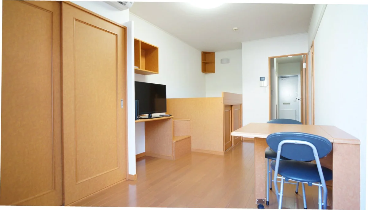 ベッド、テレビ台、テーブルも備え付けなので引越も楽!