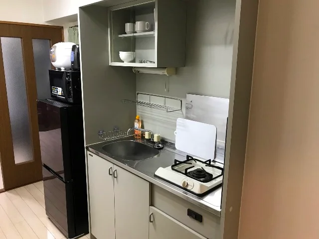 備品:片手なべ・フライパン・フライ返し・お玉包丁・まな板・キッチンバサミ・ピーラー・台所用洗剤皿洗スポンジ・大皿・中皿・お茶碗・どんぶり・マグカップ・グラス・しゃもじ炊飯器用計量カップ・ハンガー・折畳み角ハンガー(物干し用)物干し竿・ゴミ箱・トイレ用洗剤・トイレ用ブラシ・傘立て・各種小物