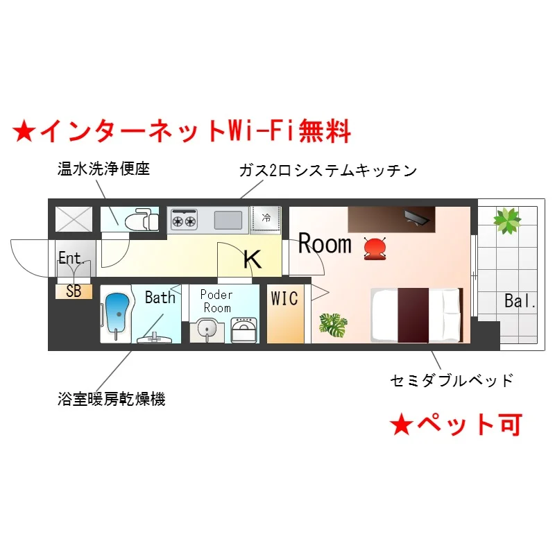 ★インターネットWi-Fi無料★ペット可★浴室暖房乾燥機・温水洗浄便座・セミダブルベッドの分譲賃貸★