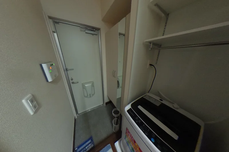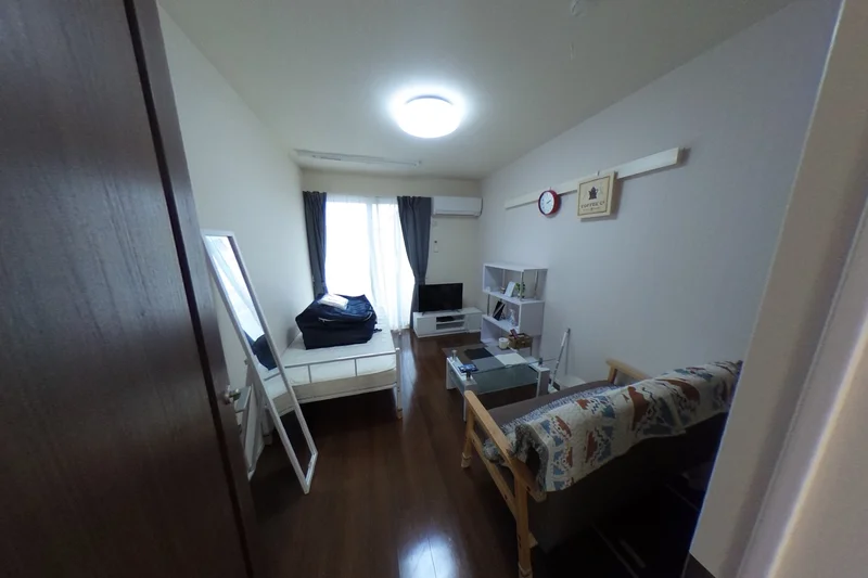 シングルベット、マットレス、フローリングワイパー、電子レンジ、炊飯器、電気ケトル、ソファ、ローテーブル、スタンドミラー、デスク、チェアー、ドライヤー、DVDプレイヤー、TV台、TV、洗濯機(室内)、冷蔵庫、カーテン(レース付き)、3段ラック、かさ立て、掛時計、絵画