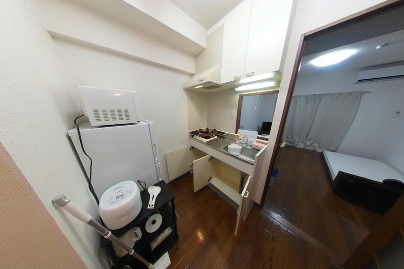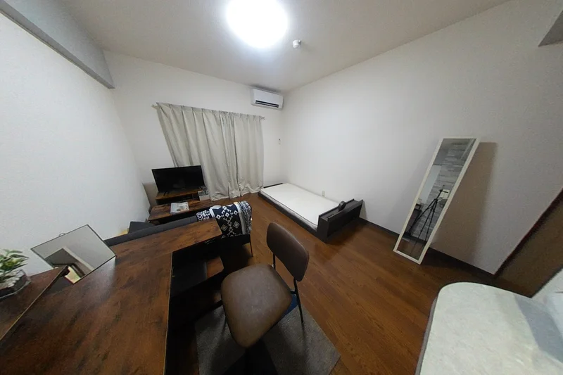 シングルベット、マットレス、フローリングワイパー、電子レンジ、炊飯器、電気ケトル、ソファ(一人掛け)、デスク、チェアー、ローテーブル、スタンドミラー、ハンガーラック、ドライヤー、DVDプレイヤー、TV台、TV、洗濯機(室内)、冷蔵庫、カーテン(レース付き)、かさ立て、置き時計