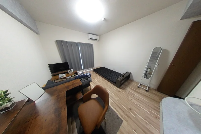 シングルベット、マットレス、フローリングワイパー、電子レンジ、炊飯器、電気ケトル、ソファ(一人掛け)、デスク、チェアー、ローテーブル、スタンドミラー、ハンガーラック、ドライヤー、DVDプレイヤー、TV台、TV、洗濯機(室内)、冷蔵庫、カーテン(レース付き)、かさ立て、置き時計